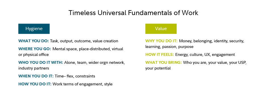 We need to put humans at the centre of every question and decision. Considering what Maslow and Herzberg have taught us about human motivation, what really matters is why you work, how it makes you feel and what value/self-actualisation you bring. In the unwritten psychological contract, it is no longer about task for time for money, but about a values exchange. It’s more about meaning than money. Therefore, giving employees agency about where, when, with whom they work, and cultivating a psychological climate of safety, trust, empowerment, meaningful work, and inspiration, will enlist their best selves. Therein lies the value for employers and employees.