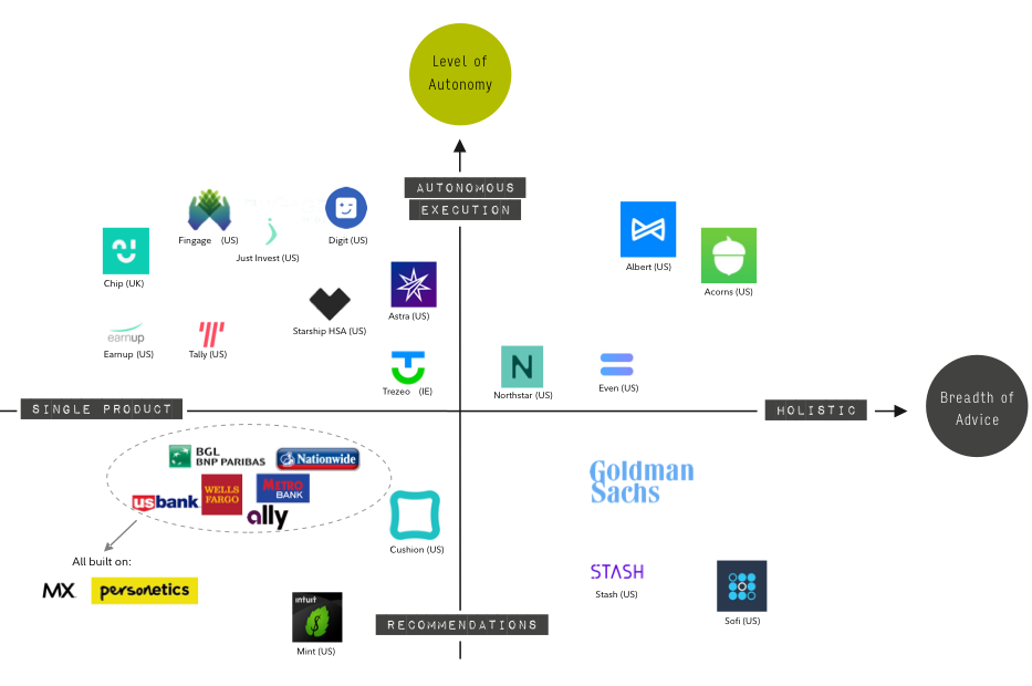 How advanced is the market for autonomous finance in 2020? Where are fintechs and incumbents making their early bets? A good way to map autonomous finance services is along two axes—the Level of Autonomy inherent to that service and the Breadth of Advice it offers.