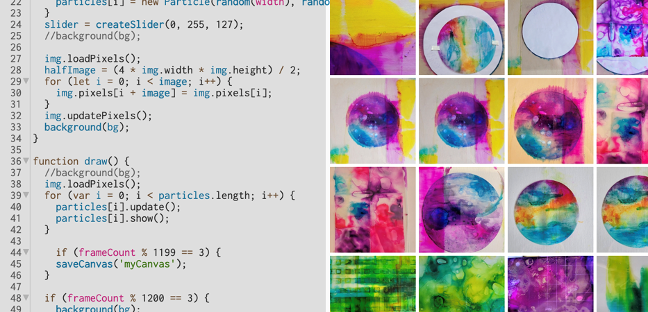 Luke: It’s all about the experiment: pick up a new program, learn the basics, and then hope for the best. I needed to go back and relearn some trigonometry and get my head 100% into JavaScript mindset. It was kind of a two-pronged approach where Kseniya was doing the experimenting with paint and different materials and I was doing the digital side. My paint was code in the form of Looping JavaScript expressions and my canvas was Processing and/or P5JS programs.