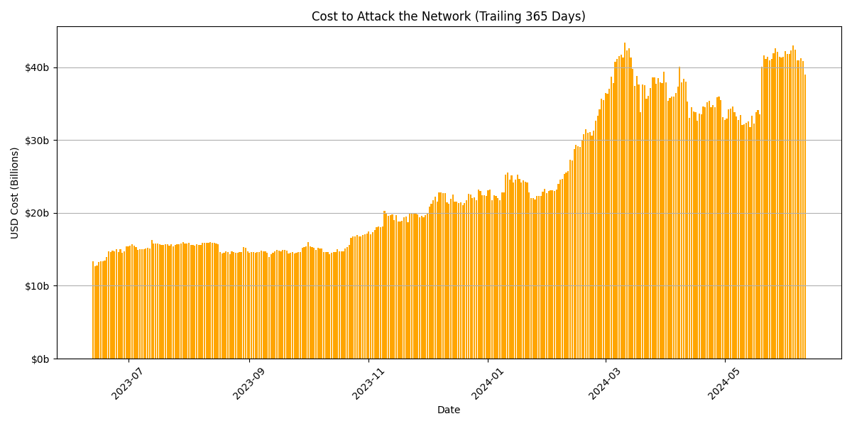 Since The Merge, the Ethereum network has matured, and its security has grown. The current cost to attack the Ethereum network is ~$40 billion per day, which can serve as a strong deterrent to bad actors.