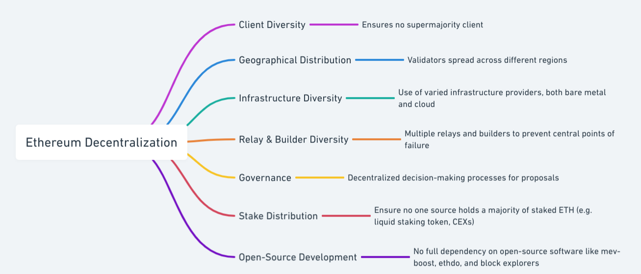 There are several components to Ethereum’s decentralization. Across each of the categories below, it is important to ensure no single points of failure: