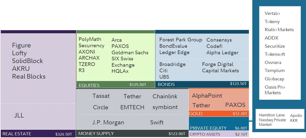 Figure 1. Note: not exhaustive selection of fintechs and incumbents. Numbers represent the size of asset class. | Source: Savills (Real Estate), Sifma (Bonds, Equities), Ark Invest (M2), Blackrock (Private Equity), Coinmarketcap (Crypto Assets), FCAT Research