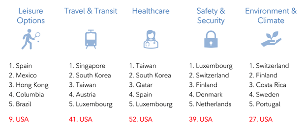 Figure 1: USA doesn’t rank in the top 5 for any quality-of-life considerations. Source: 2023 Expat Insider survey.