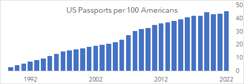 Figure 2: U.S Passports per 100 Americans has grown 10 times faster than the population. Source: FCAT analysis of US State Department and Census data.