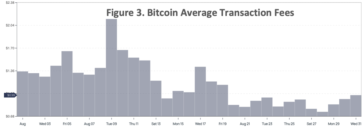 Bitcoin was initially designed to serve as a currency – one that is incorruptible by governments and individuals. However, the Bitcoin network is too slow and expensive to serve as a global, high-traffic payment mechanism for everyday purchases. Network fees averaged $1.14 per transaction during the month of August as Figure 3 shows. Miners also are incentivized to validate transactions with higher fees, which can introduce inequality. Bitcoin can process approximately 7 transactions per second (TPS). By comparison, newer blockchains with simpler consensus mechanisms routinely process thousands of TPS and are actively developing scaling solutions to increase throughput.