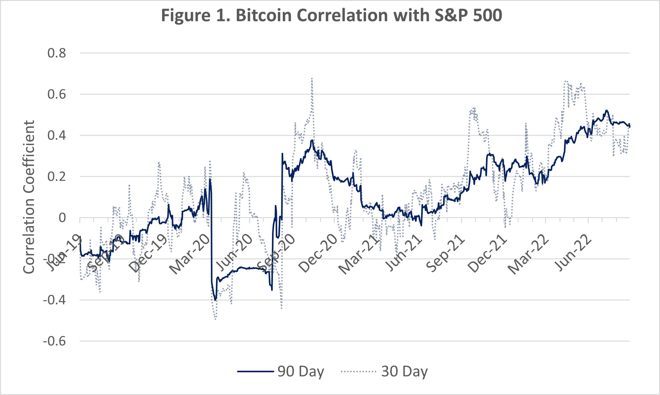 Source: Sherlock Analytics. Dates observed: January 1, 2019 to August 31, 2022. These data reflect the Pearson correlation coefficient over a rolling 30-day period and 90-day period (see Glossary of Terms for more detail). For consistency, we only compared the days on which both assets are traded and the daily closing time (4pm EST) of US markets.