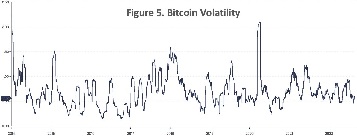 The recent economic shocks stemming from COVID-19 – inflation, interest rate hikes, and supply chain bottlenecks – and Russia’s invasion of Ukraine have caused a selloff of risk assets. Bitcoin has been a victim of the selloff. Figure 1 shows the steady increase in bitcoin’s correlation to the S&P 500 since the economic impacts of pandemic response measures landed towards the end of 2021. The 90-day correlation coefficient of 0.44 (as of August 31st) is trending near all-time highs.