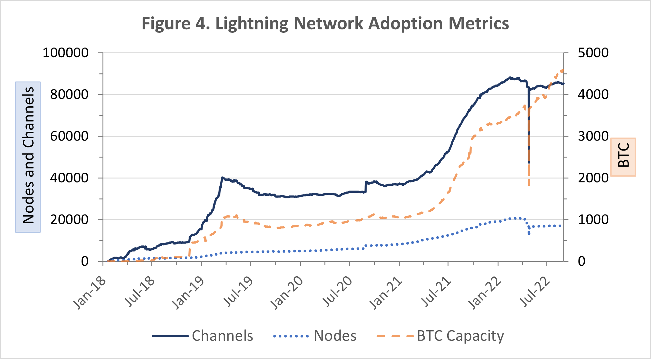 Source: BitcoinVisuals. Dates observed: January 19, 2018 to August 31, 2022. A steep drop in capacity is visible on April 18th, 2022, likely due to disruption on a prominent node.10