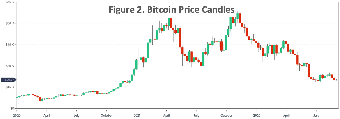 Looking back further, the onset of the COVID-19 pandemic in March 2020 sent BTC tumbling 43% in less than a week. Similarly, the S&P 500 dropped 15% over the same period (and further extended its losses for several days thereafter). In the US, a favorable monetary policy response resulted in money flowing back into risk assets. Figure 2 shows that bitcoin’s price, by contrast, recovered and stabilized for several months resulting in negative correlation to the S&P 500 (Figure 1). BTC ultimately reached a new all-time high of $69.9k in November 2021 before dropping to its current value of roughly $21k today. The decline coincided with higher-than-expected inflation data and interest rate hikes.
